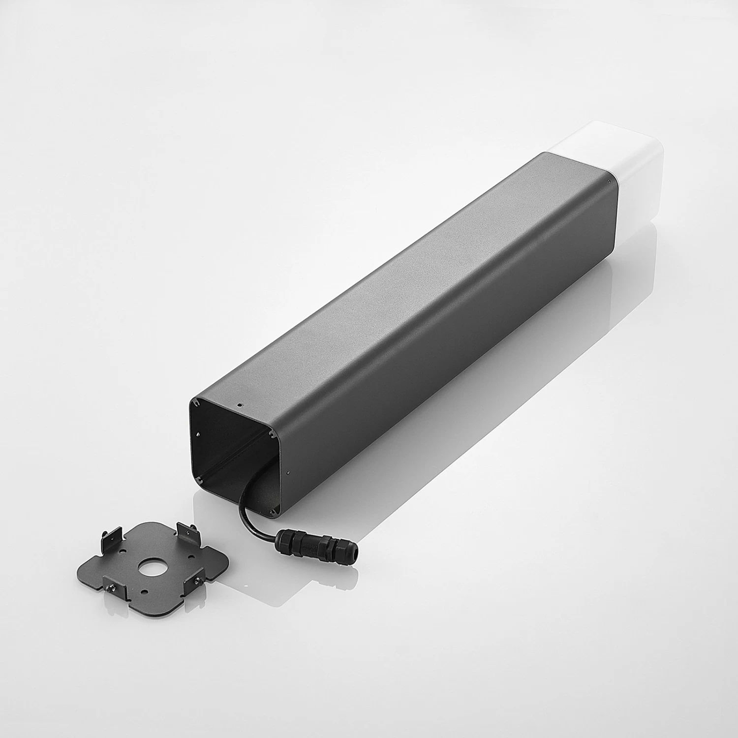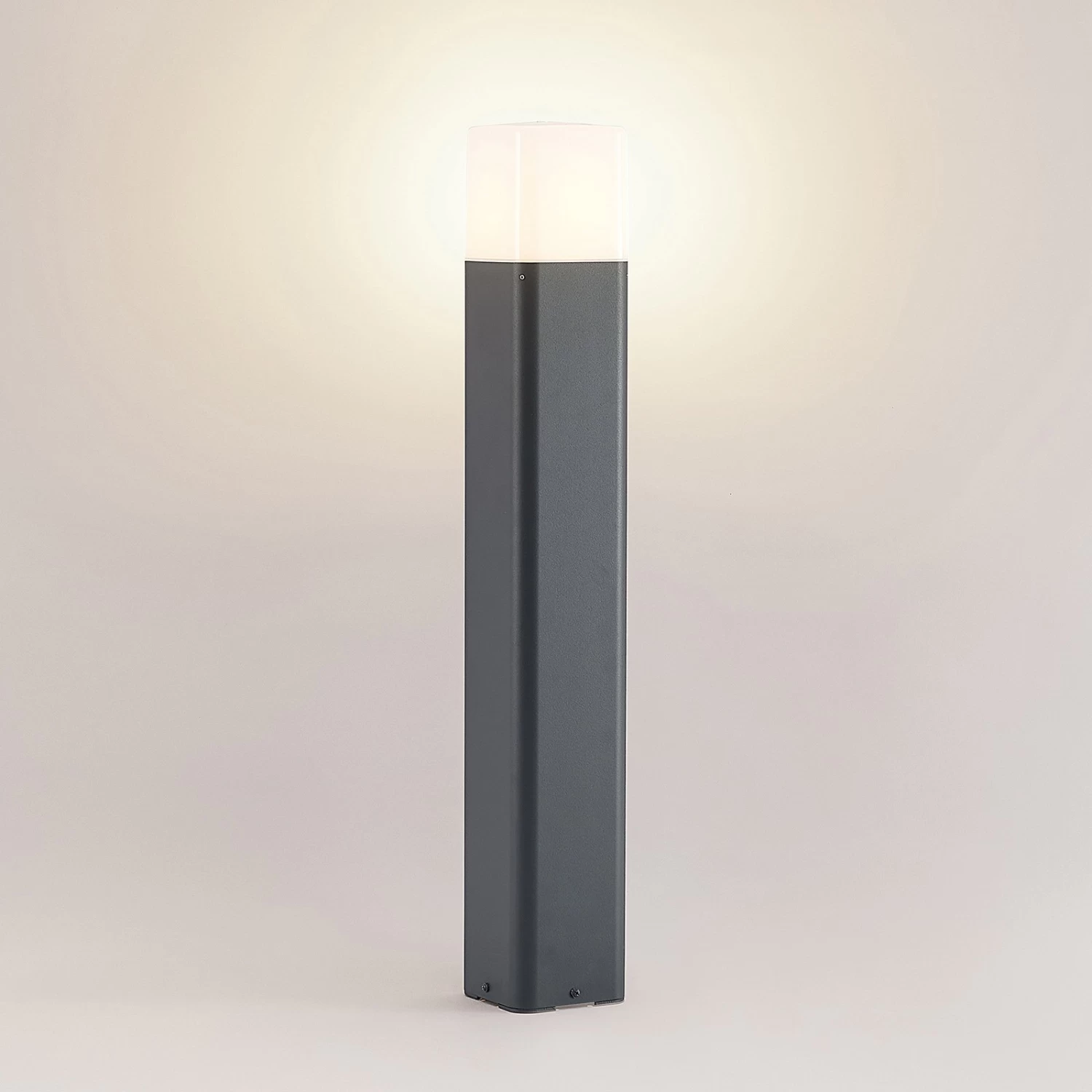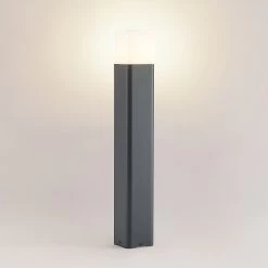Vielseitig rund ums Haus einsetzbar, bietet die moderne Wegeleuchte Obuna ein gute, blendfreie Beleuchtung, die fĂŒr Sicherheit und Orientierung im Dunkeln sorgt. Die Leuchte besteht aus einem Korpus aus dunkelgrauem Aluminium, der viereckig gesaltet und mit einem opalweiĂen Kunststoffschirm auf der Oberseite ergĂ€nzt wird. Dieser verbirgt und schĂŒtzt das innenliegende Leuchtmittel, welches nicht im Lieferumfang enthalten und separat erhĂ€ltlich ist. Das Licht kann dann durch den Schirm gleichmĂ€Ăig in die Umgebung leuchten.