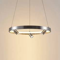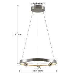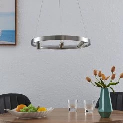 Die LED-HĂ€ngeleuchte Paliva wurde aus Eisen verarbeitet und fĂ€llt mit ihrem ringförmigen GehĂ€use sofort auf. Sie ist auf dezentem Kupferdraht an der Deckenhalterung befestigt, sodass das GehĂ€use und die Lichtquellen optisch im Vordergrund stehen. Das moderne Design wird von ihrem OberflĂ€chenfinish in Nickel untermalt. Diese relativ neutrale und zugleich solide Farbe lĂ€sst sich in unterschiedliches Interieur eingliedern. Die fest verbauten LEDs spenden warmweiĂen Lichtschein, der fĂŒr ein angenehmes Ambiente sorgt. Die Leuchte kommt ĂŒber einem Esszimmertisch, einer Theke oder auch in einer Lobby im gewerblichen Bereich sehr schön zur Geltung.