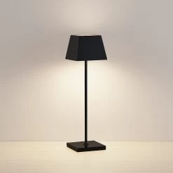 Die LED-Tischlampe Patini hat ein strukturiertes Design und klar definierte Formen. Sowohl der Leuchtenfuß als auch der Leuchtenschirm sind kantig gestaltet, sodass die Leuchte einen geometrisch angehauchten Look bekommt. Das klassische Schwarz trägt zum Charakter der Tischleuchte bei und lässt sie sich optisch von der Umgebung abheben.