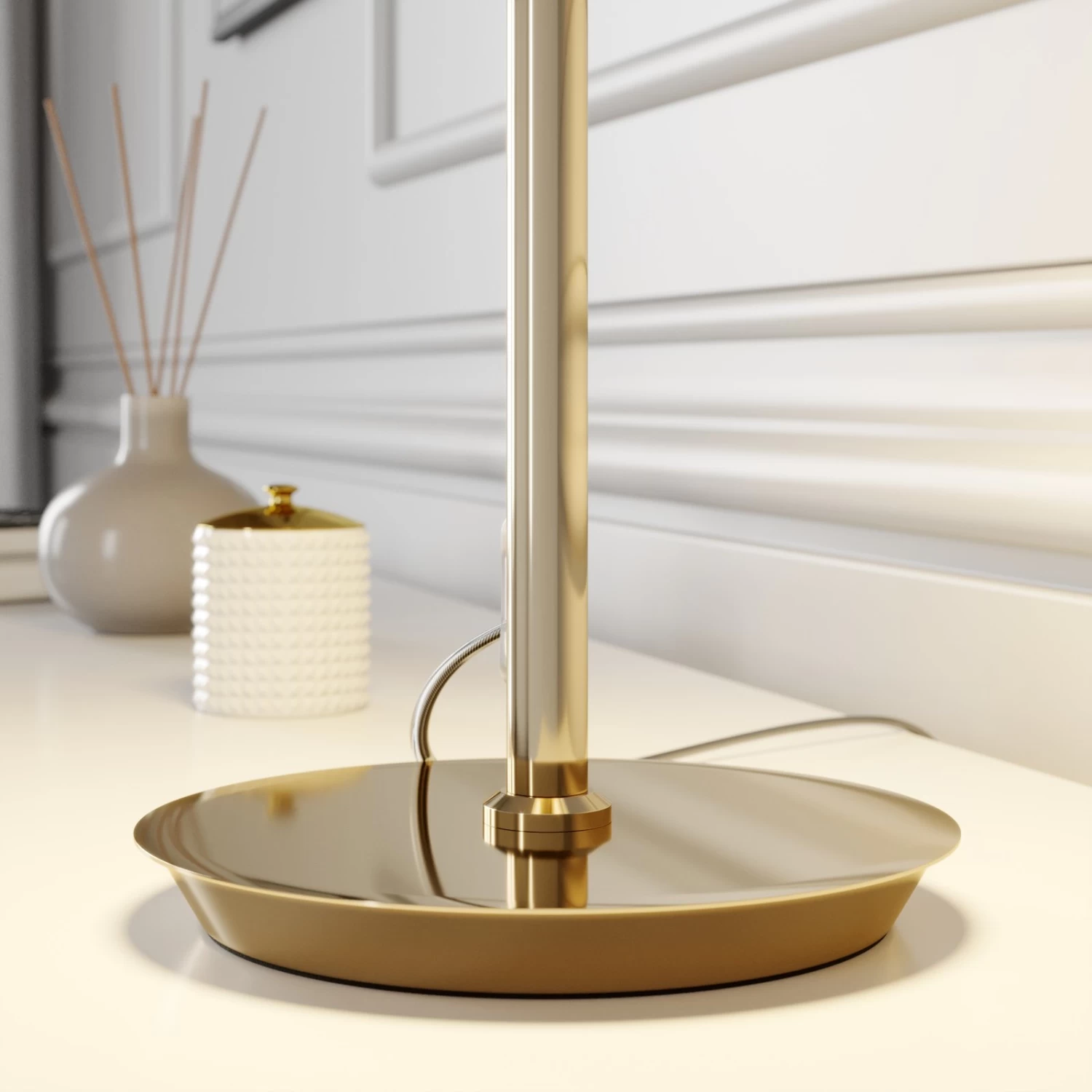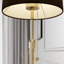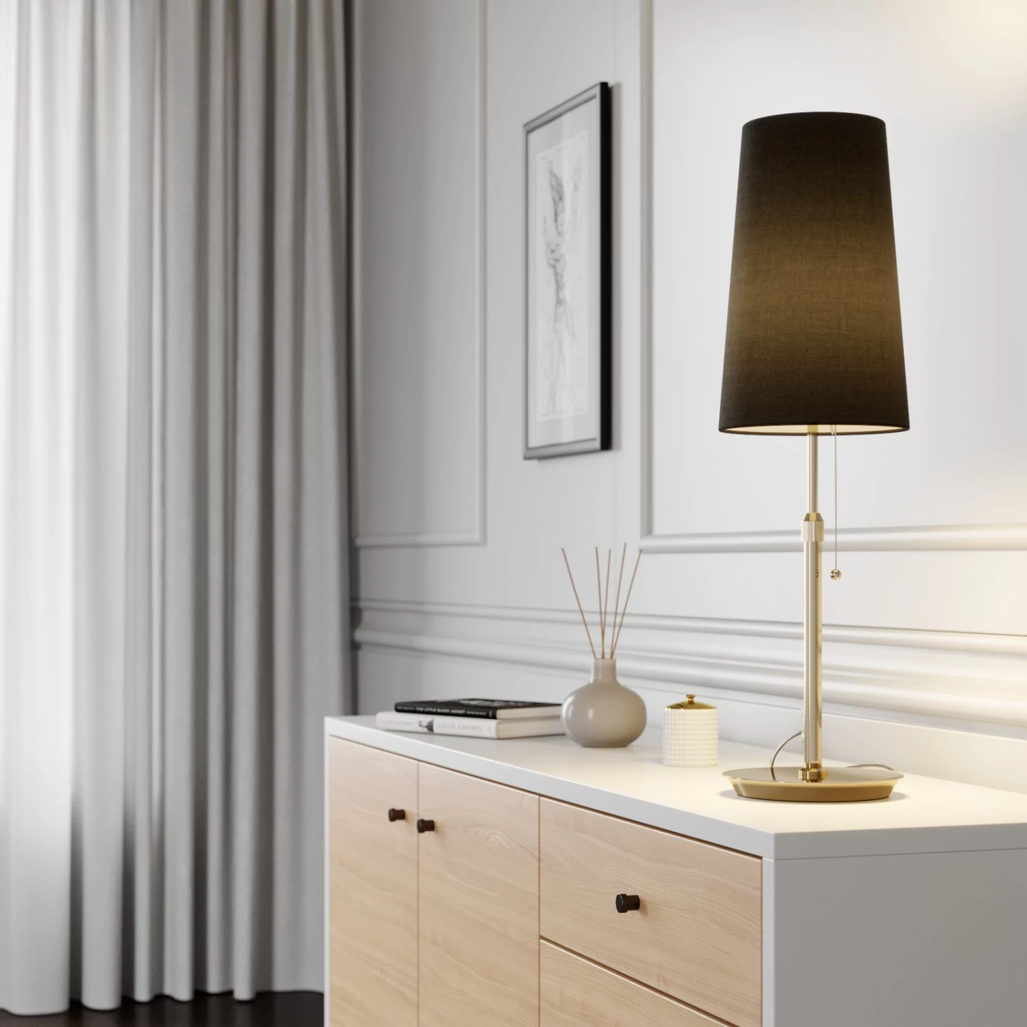 Pordis passt mit dem Gestell in Messing sehr gut zu klassisch wirkenden Einrichtungen. Der schwarze Stoffschirm ergĂ€nzt das Gesamtdesign der Tischlampe auf stilvolle, passende Weise und sorgt fĂŒr abgedĂ€mpften Lichtschein mit behaglicher Wirkung, so dass man Pordis gut als Akzentbeleuchtung im Wohnbereich einsetzen kann, wenn die GemĂŒtlichkeit in den Vordergrund rĂŒcken soll und strahlend helles Licht nicht mehr dringend benötigt wird. Ăber ein TeleskopgestĂ€nge lĂ€sst sich die Höhe des Gestells von 61 cm bis 70,5 cm einstellen und somit an die Gegebenheiten vor Ort anpassen. Mit diesem recht hohen MaĂ eignet sich die Tischlampe Pordis auch als Hockerleuchte sehr gut. Eingeschaltet wird die Leuchte ĂŒber einen Zugschalter, der edel wirkt und das gesamte Design passend ergĂ€nzt.