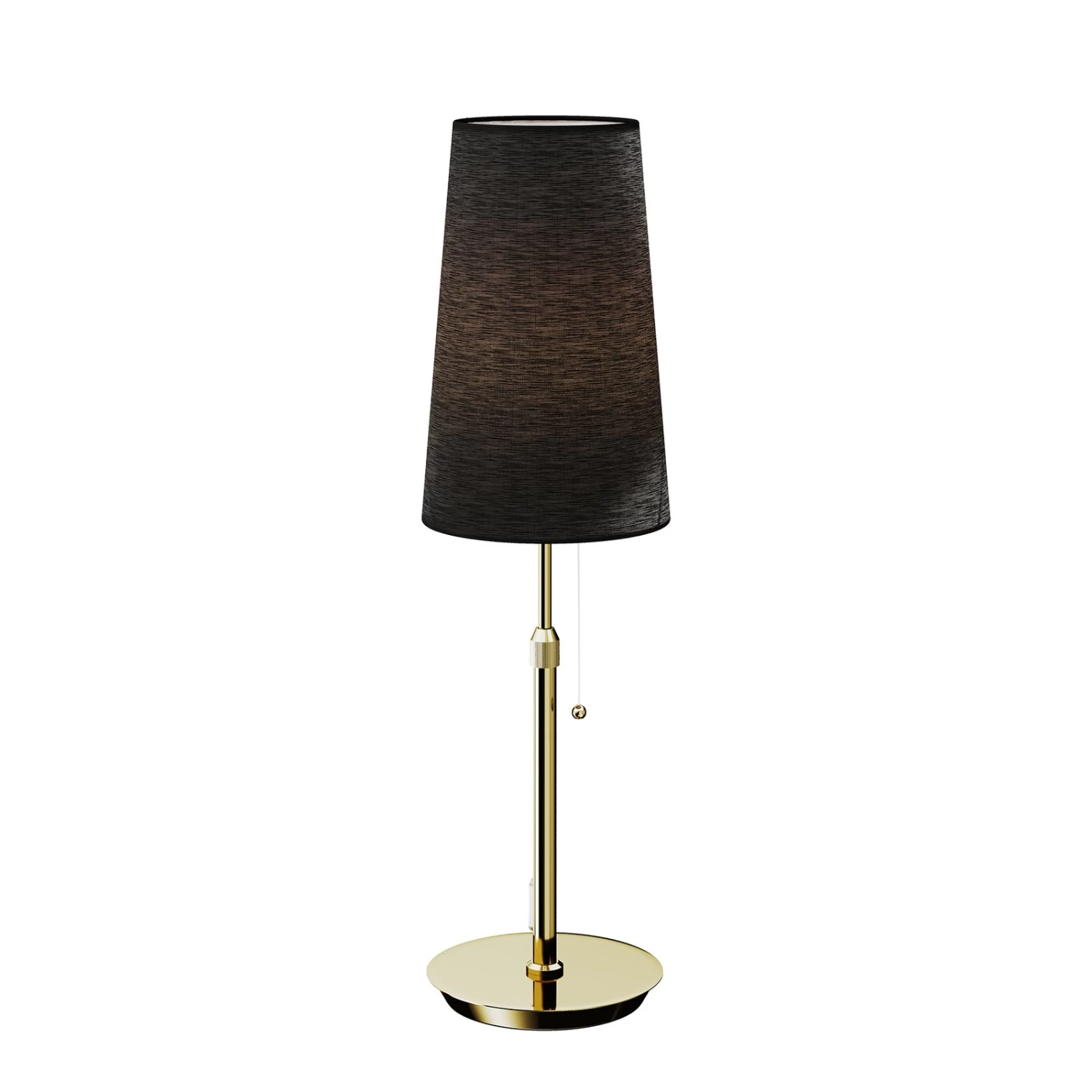 Schmale Stoff-Tischleuchte Pordis mit schwarzem Textilschirm und Metallgestell in Messing, höhenverstellbar