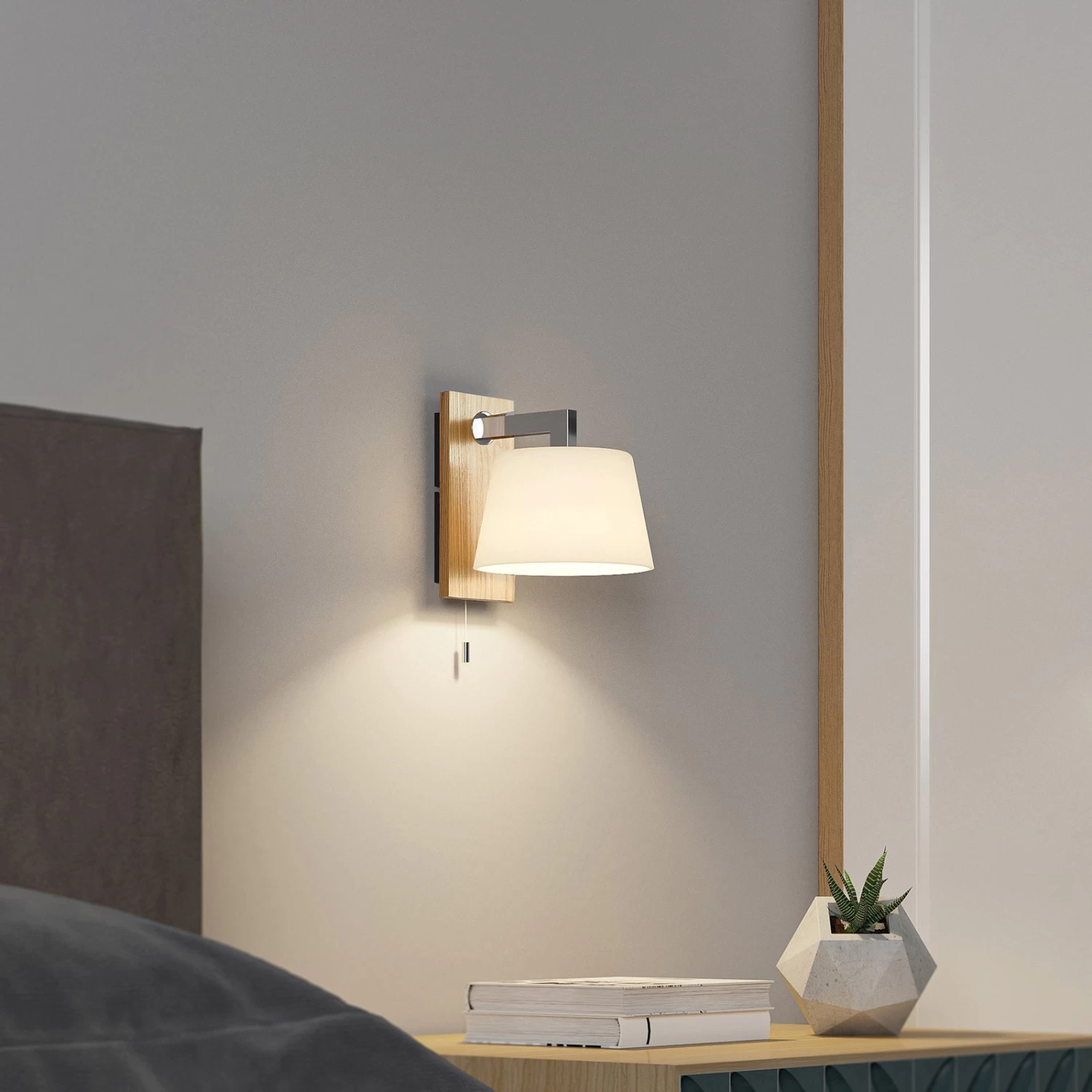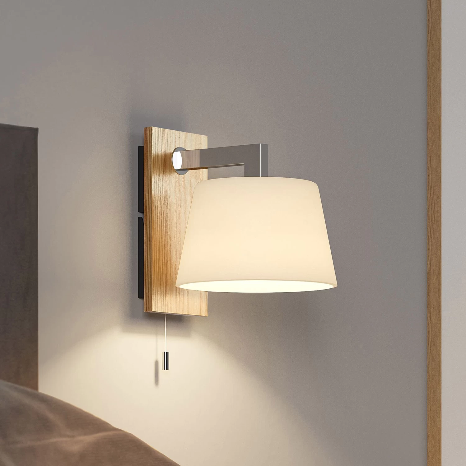 Hier verbinden sich drei Komponenten zu einem schönen und ĂŒberzeugenden Look, denn die Wandleuchte hat einen runden Glasschirm und eine Wandhalterung aus hellem Holz, die von einem verchromten Metallelement miteinander verbunden werden. Der Lichtschein ist warm, weich und wohnlich – ganz das, was man im Schlafzimmer oder Wohnbereich sucht, wenn man sich nach getaner Arbeit zurĂŒcklehnen möchte. Ein Zugschalter komplettiert die Leuchte und sorgt fĂŒr ein unkompliziertes Ein- und Ausschalten.