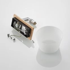 Schöne Glas-Wandleuchte Rhea mit Holzwandhalterung und verchromten Elementen