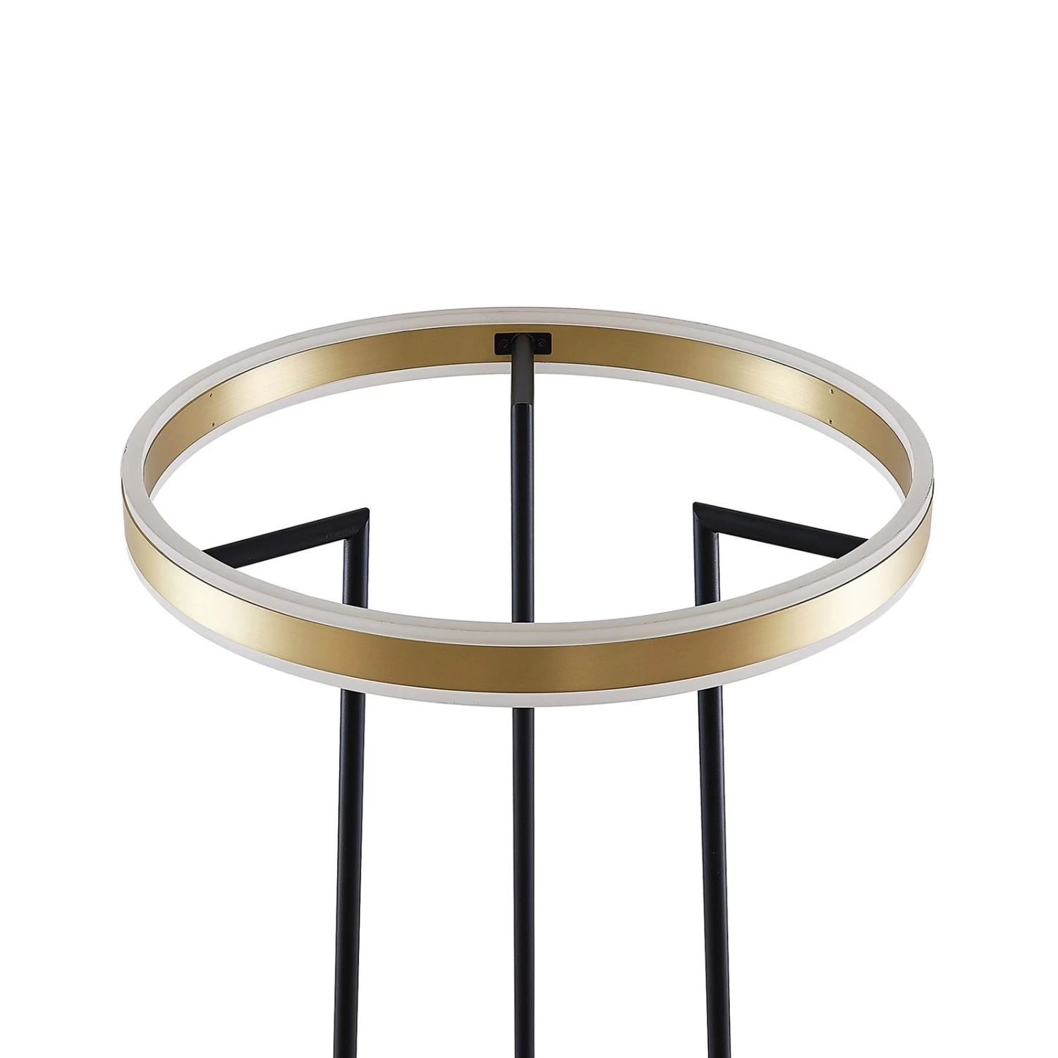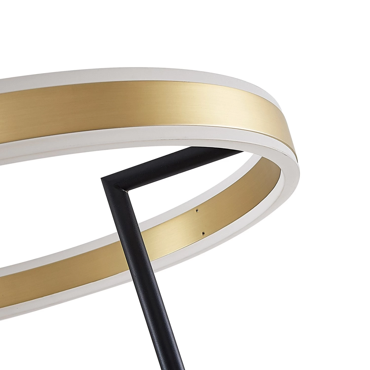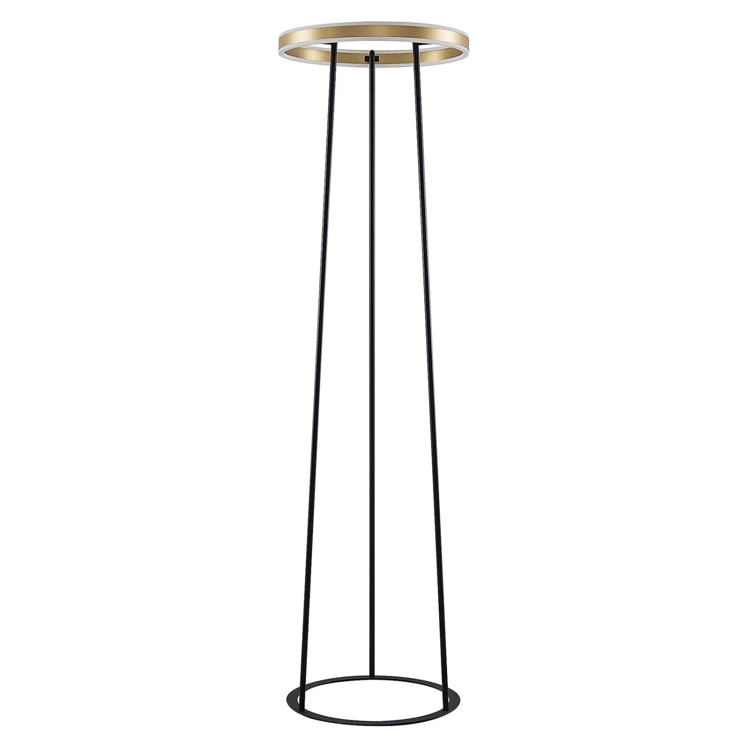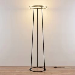 Seppe ist eine Stehleuchte aus der Feder des Designers Johannes Tomm, die mit detailreduzierter und doch wirkungsvoller Formensprache daherkommt. Der FuĂ ist ringförmig, ebenso das Leuchtelement mit den warmweiĂen LEDs an der Oberseite, das ein mattes Messingfinish besitzt. Dazwischen befinden sich drei schwarze Streben aus Metall, die das eine mit dem anderen verbinden.