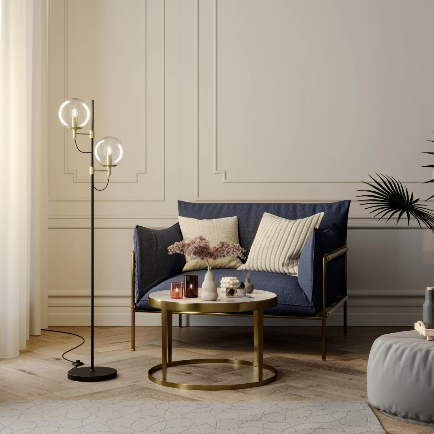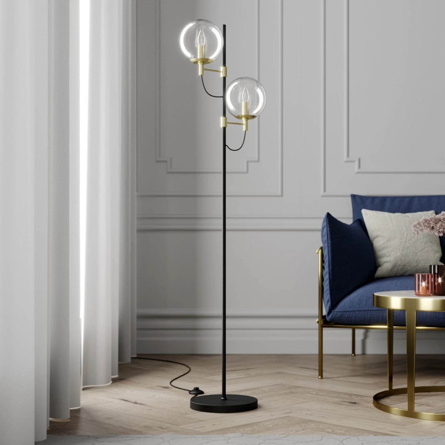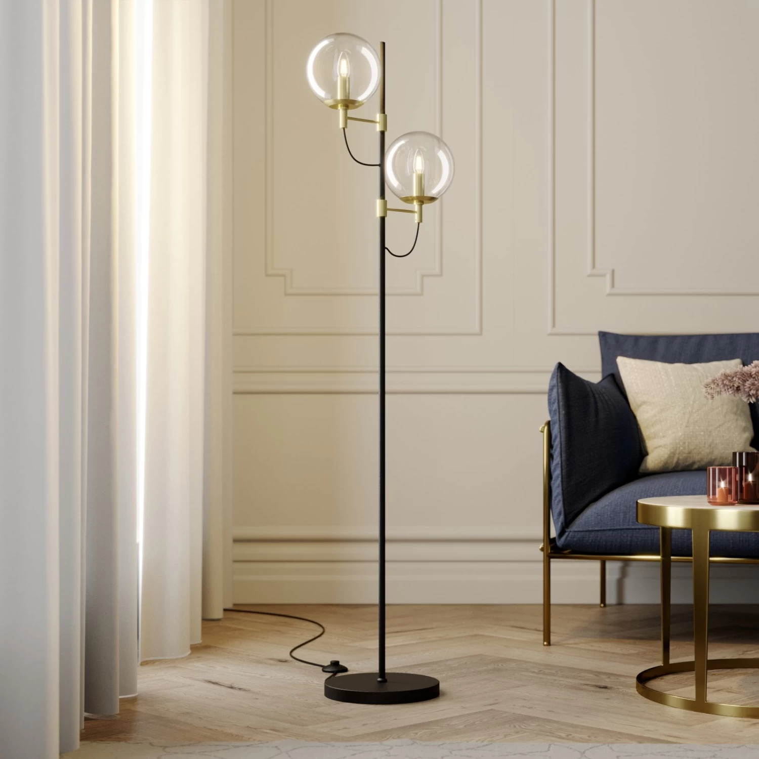Zweiflammige Design-Stehleuchte Sotiana mit zwei Glaskugeln, edler Vintagelook