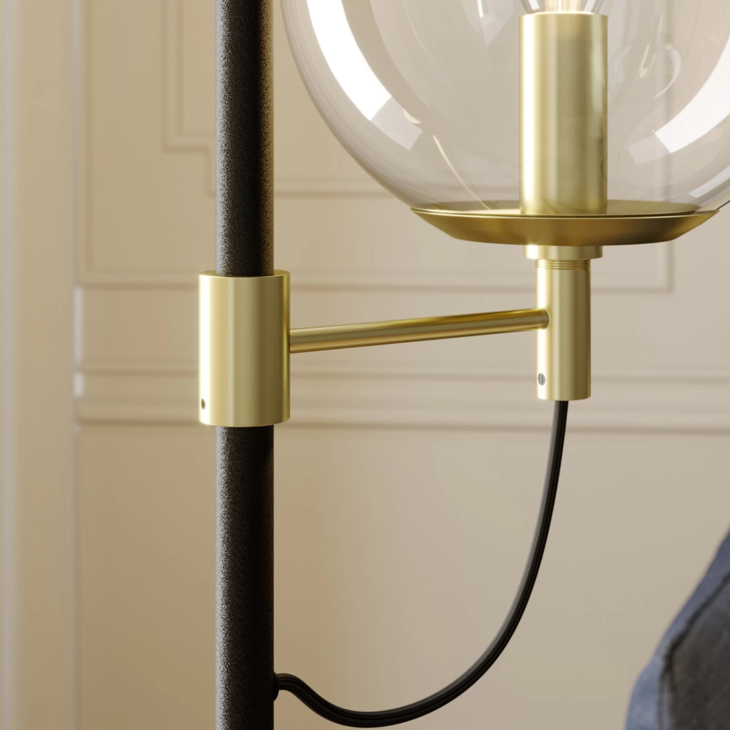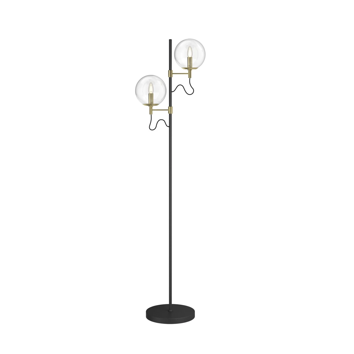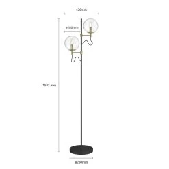 Sotiana ist eine Stehlampe, die mit ihrem eleganten Erscheinungsbild besonders schön zur Geltung kommt und in Wohnzimmern eine echte Bereicherung darstellt. Das Leuchtendesign wirkt angenehm klassisch und verkörpert sowohl eine gewisse Geradlinigkeit als auch einen Hauch Luxus. Seitlich von einer schmalen, schwarzen Metallstange gehen zwei Lampenschirme ab, die jeweils aus einer klaren Glaskugel bestehen und in unterschiedlicher Höhe angebracht sind. Das Design verkörpert einen gewissen Vintagelook, als ob es einem lÀngst vergangenen Jahrzehnt des letzten Jahrhunderts entstammt, und wird dekorativ ergÀnzt von Metallarmaturen mit einem edlen OberflÀchenfinish in Messing. Aufgrund des Glasdesigns empfehlen sich ansprechende Filamentlampen in Tropfenform, die das Gesamtdesign schön unterstreichen.