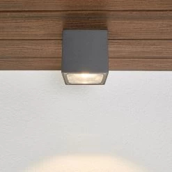 Nutzt man die LED-Deckenleuchte Tanea zur Beleuchtung von Überdachungen im Außenbereich, wie man sie zum Beispiel bei Hauseingängen oder über Terrassen und Balkonen vorfindet, dann hat man dort einen relativ schlichten Lichtspender mit dezenter Präsenz. Der Schirm bzw. Leuchtenkörper ist würfelförmig, besteht aus Aludruckguss und hat ein dunkelgraues Finish. Überdies gewährleistet die LED-Technik, dass der Energieverbrauch auf niedrigem Level angesiedelt ist.