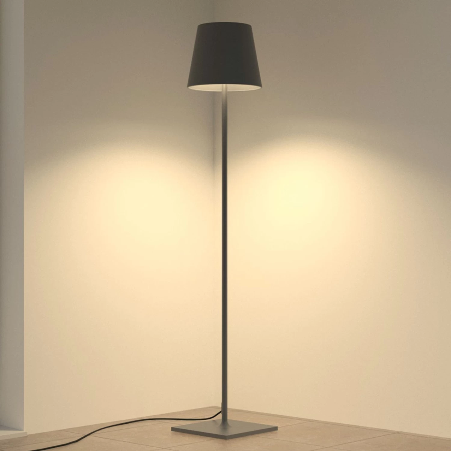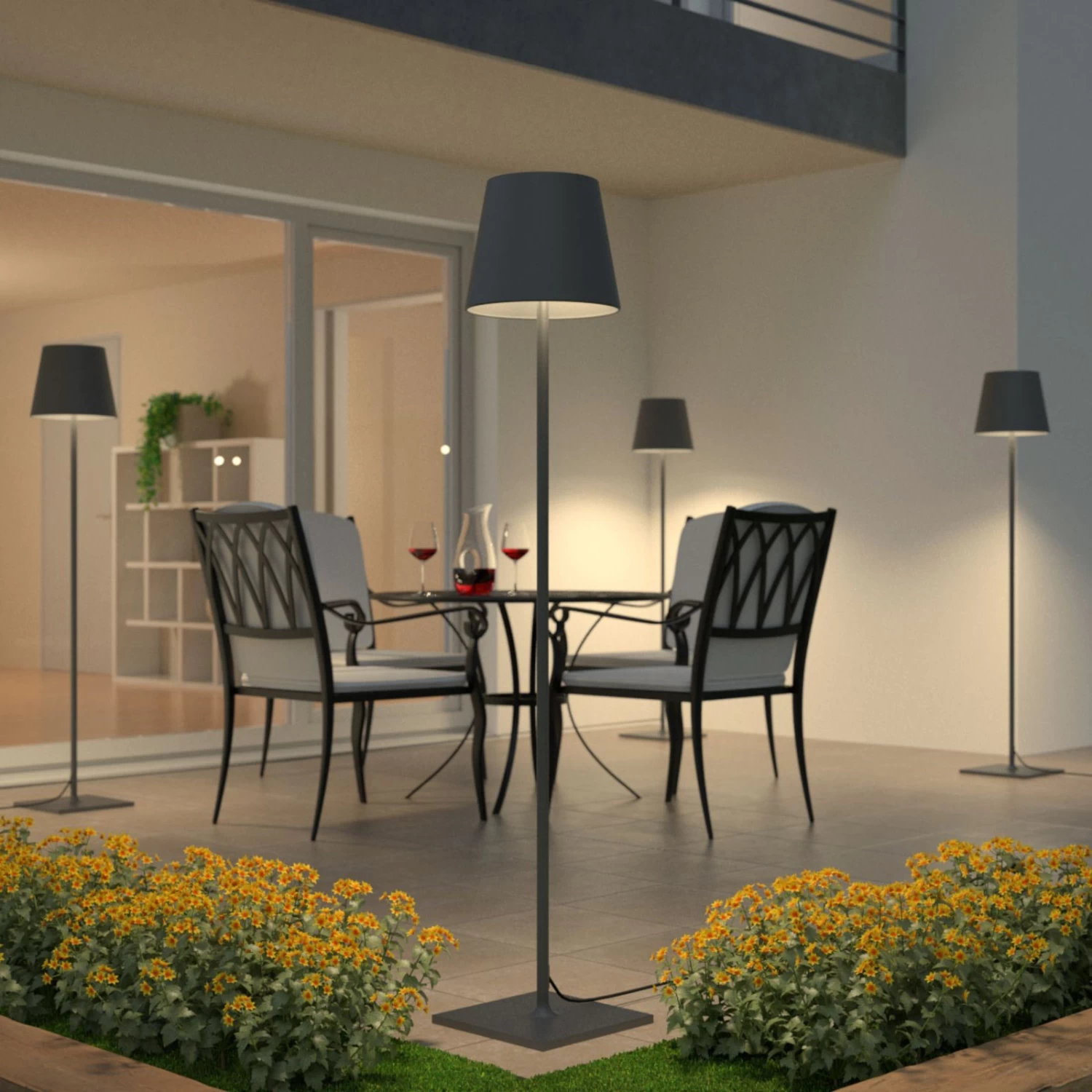 Die Außenleuchte Andrei ist wunderbar für eine stimmungsvolle Beleuchtung der Terrasse geeignet und präsentiert sich in Form einer klassischen Stehlampe, wie man sie aus dem Innenbereich kennt. Hier kommt aber nicht etwa Stoff oder ein ähnliches Material zum Einsatz, der gesamte Leuchtenkörper vom Schirm bis zum Fuß ist stattdessen aus dunkelgrauem Aluminium gefertigt und wirkt wie aus einem Guss. Außerdem ist die Leuchte so gut abgedichtet, dass sie die Anforderungen der Schutzart IP54 erfüllt und ohne Bedenken im Außenbereich zum Einsatz kommen kann. Das Licht der Stehlampe wirkt wunderbar gemütlich, denn der Lichtschein entweicht lediglich nach unten und ist vollkommen blendfrei. So kann man es sich auf einer stilvoll ausgestatteten Terrasse mit Lounge-Möbeln im Sommer Abend für Abend gemütlich machen und die wunderbare Jahreszeit in vollen Zügen genießen, gerne bei einem kühlen Getränk, wie zum Beispiel dem Trendcocktail des Jahres.