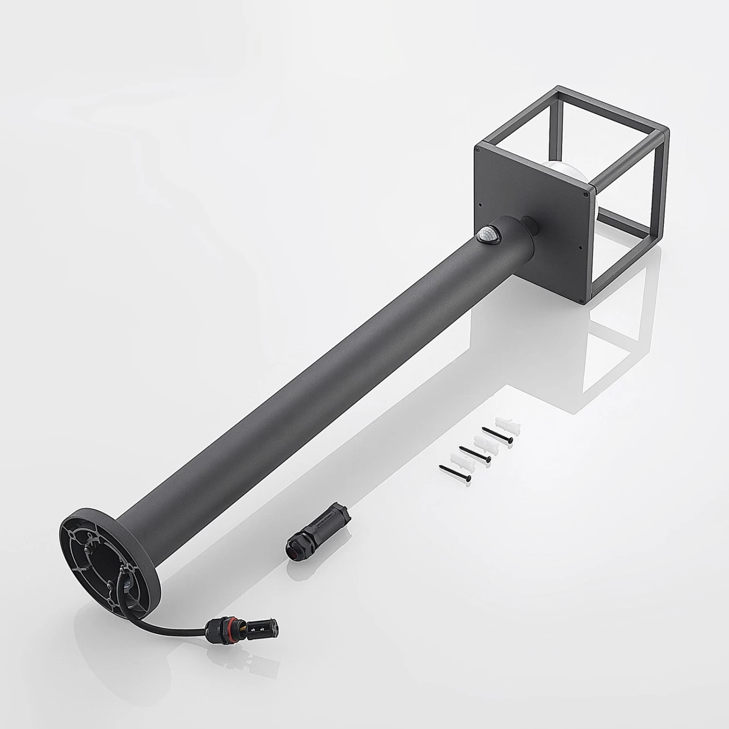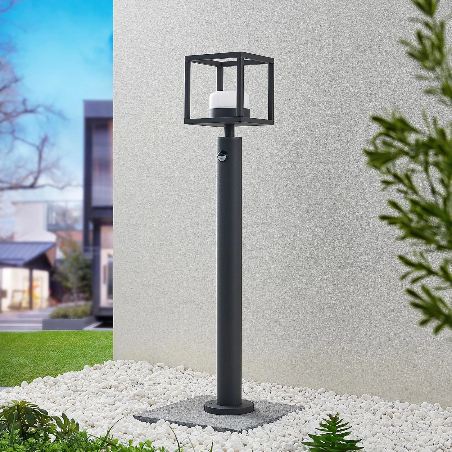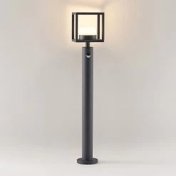 Die Wegeleuchte Timio punktet mit ihrer modernen Technik und ihrem designorientierten Look. Sie wurde aus robustem Aluminium hergestellt und besitzt einen stabilen Fuß. Im Vordergrund des Designs steht jedoch der quaderförmige Rahmen, der die weiße Leuchtschirmabdeckung umgibt. Seine geometrische Gestalt lässt sich gut mit modernen Stilen kombinieren. Diese Wegeleuchte besitzt einen Bewegungsmelder, der Bewegungen in einem Winkel von 120° und in einer Entfernung von 6 bis zu 10 Metern erfassen kann. Die Leuchtdauer kann manuell von 8 Sekunden bis zu 8 Minuten vom Nutzer selbst eingestellt werden. Außerdem besitzt Timio auch einen Dämmerungssensor, der automatisch die Helligkeit im Außenbereich registriert.