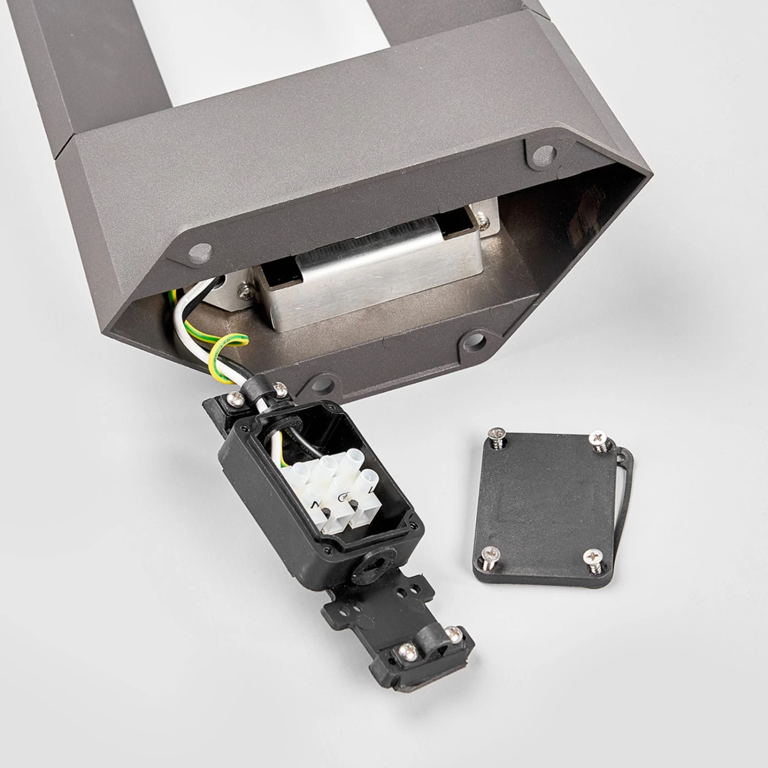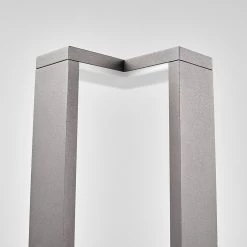Die Oberfläche des Aluminiumkorpus der LED-Wegelampe Jeny ist grafitgrau lackiert worden. Das allein entfaltet schon eine moderne Wirkung, aber es ist natürlich vor allem die Form dieses Lichtspenders, die alles andere als gewöhnlich ist. Das Gestell erscheint in Form eines Rahmens, wohingegen der Schirm, den man nur in großer Abstraktion so nennen kann, sich als in den Raum hineinragende Pfeilspitze präsentiert oder auch Assoziationen an ein Dreieck weckt. Die in warmweißer Lichtfarbe leuchtenden LEDs zeichnen sich durch eine gute Energieeffizienz aus und verbrauchen nur wenig Strom.