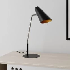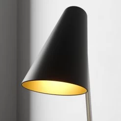 Modern, funktional, komfortabel bedienbar – die Tischleuchte Wibke besitzt einen konisch geformten Leuchtenschirm, der sich einmal durch seine Verstellbarkeit auszeichnet und optisch durch die innere Lackierung in Gold. Zudem befindet sich auf der Oberseite des Schirms ein Schalter, sodass das Ein- und Auschalten der Tischlampe bequem und vor allem einfach und ohne lĂ€stige Suche nach dem Schalter am Kabel erfolgen kann. Wibke eignet sich als zusĂ€tzliche Lichtquelle auf einem Beistelltisch, aber auch als moderne Beleuchtung am Schreibtisch.
