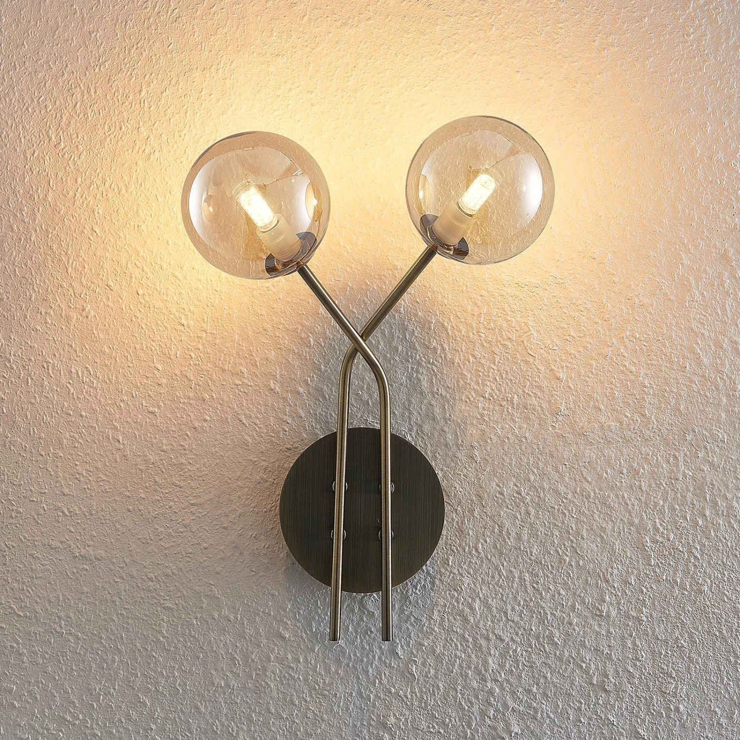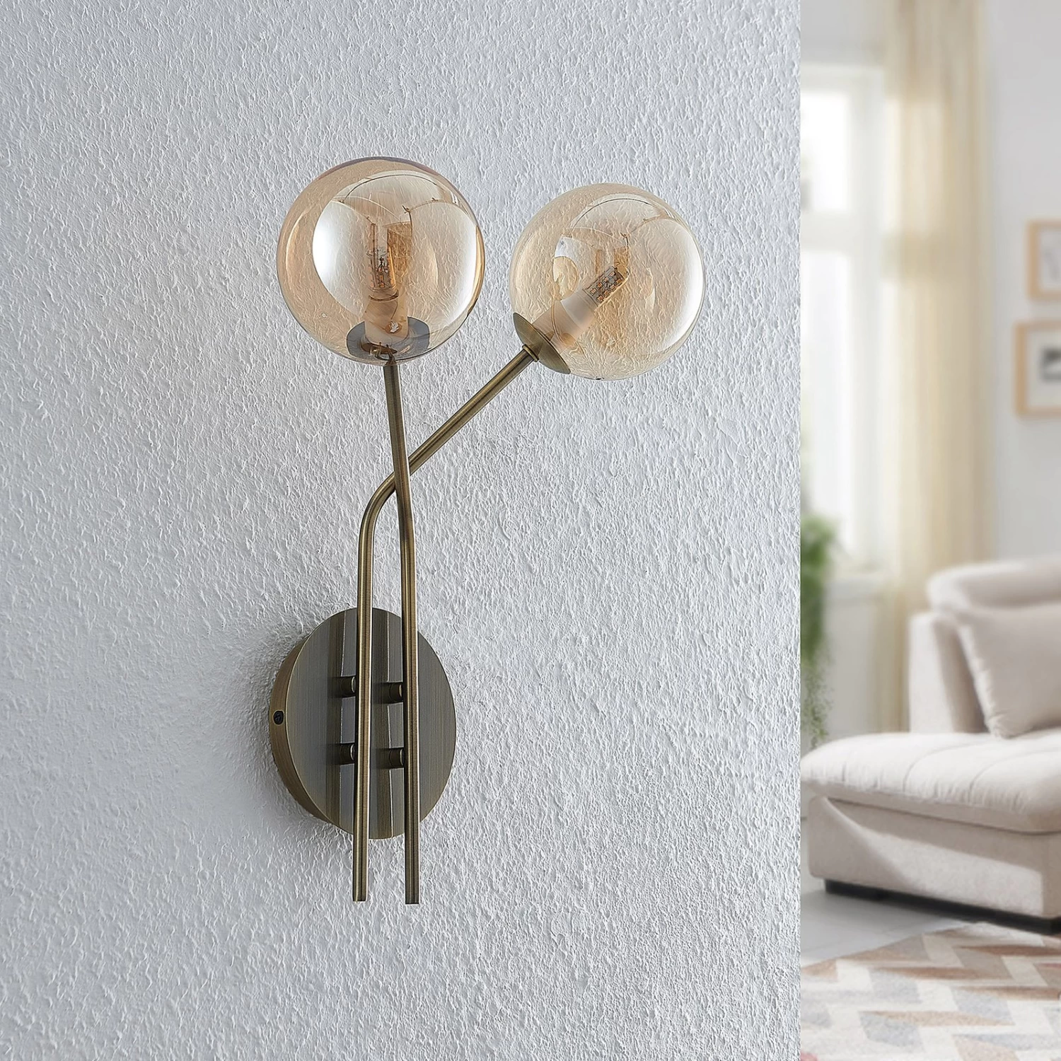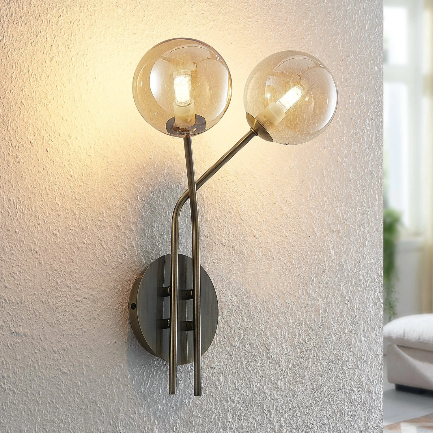 Elegante Wohnraum-Wandleuchte Wynona mit einer farblichen Kombination aus Amber und Altmessing