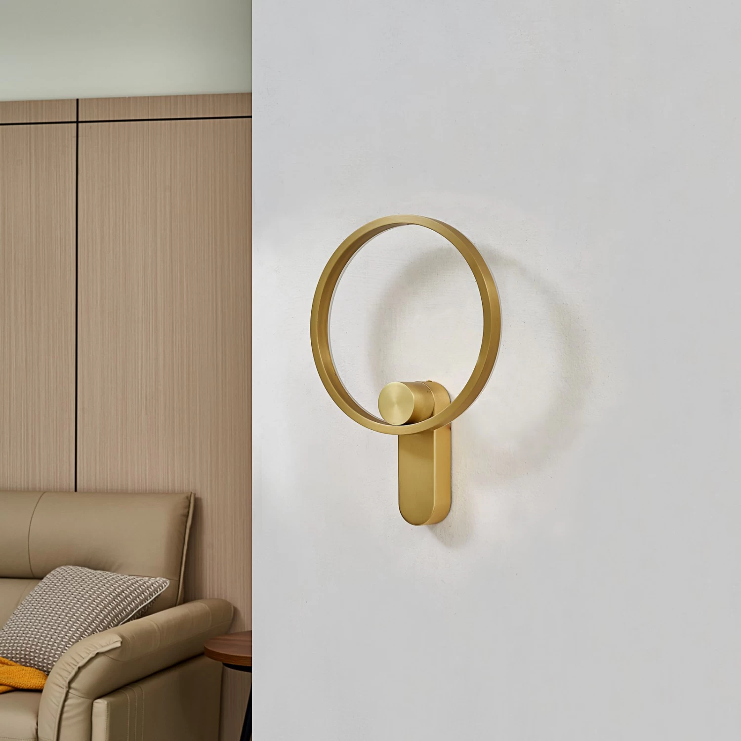 Yekta ist eine Design-Wandlampe mit formvollendeter und durchdachter Optik, die im Wohnzimmer oder auch in einem Schlafraum auf ganzer Linie ĂŒberzeugt, sowohl mit der Form als auch mit Blick auf das messingfarbene Finish und die Lichtwirkung. Statt eines gewöhnlichen Schirmes findet man hier einen Leuchtring vor, der an der RĂŒckseite mit LEDs bestĂŒckt ist, so dass das warmweiĂe Licht vorwiegend als indirekt wahrgenommen wird und maĂgeblich zur GemĂŒtlichkeit im Raum beitrĂ€gt. Ăber den normalen Schalter an der Wand kann man die Helligkeit zudem in drei Stufen verĂ€ndern, was mehr FlexibilitĂ€t bei der Beleuchtung ermöglicht. Die OberflĂ€che in Messing verleiht dem modernen Design eine etwas klassischere Note.